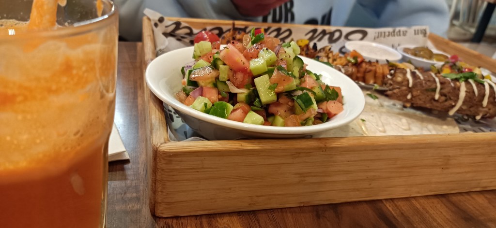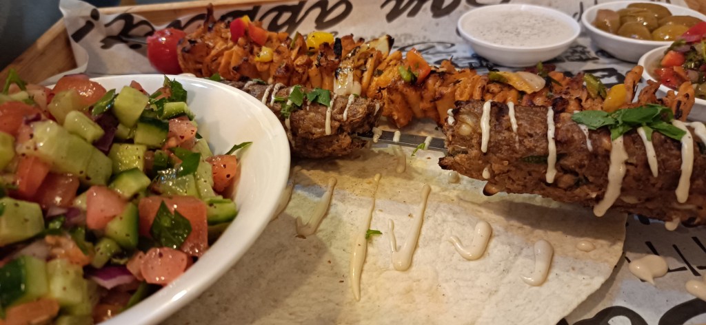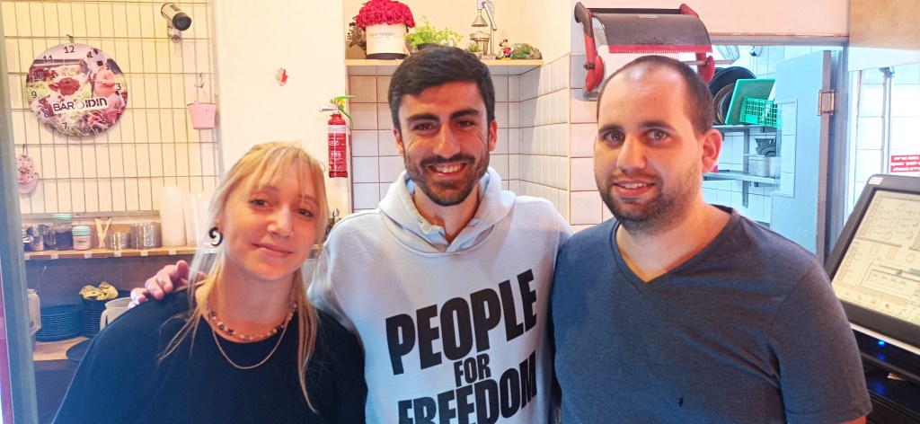 Arrivé sur place, le patron Omri Raviv, un farouche partisan de la cause animale nous fait bon accueil. L’endroit est simple et mon ami ne manque pas de m’expliquer que ce minimalisme cadre parfaitement avec le mouvement vegan mondial, ce qui n’est pas un manque de réalisme à son avis : « En 2030, le marché des aliments à base de végétal pourrait représenter jusqu’à 7,7 % du marché mondial des protéines d’après l’étude Bloomberg. Le marché mondial des protéines végétales devrait donc être multiplié par plus de cinq entre 2020 et 2030. lekhayim ! » Je lève mon verre, il sourit, je mange mon couscous, lui ses brochettes. C’est bon, très bon. Si je m’écoutais, je ferais comme tous ces Israéliens, qui pendant « l’opération Dougo » publient des photos de leur repas sur les réseaux sociaux avec la mention « Am Israël Haï ».
