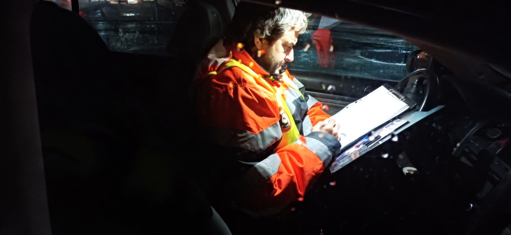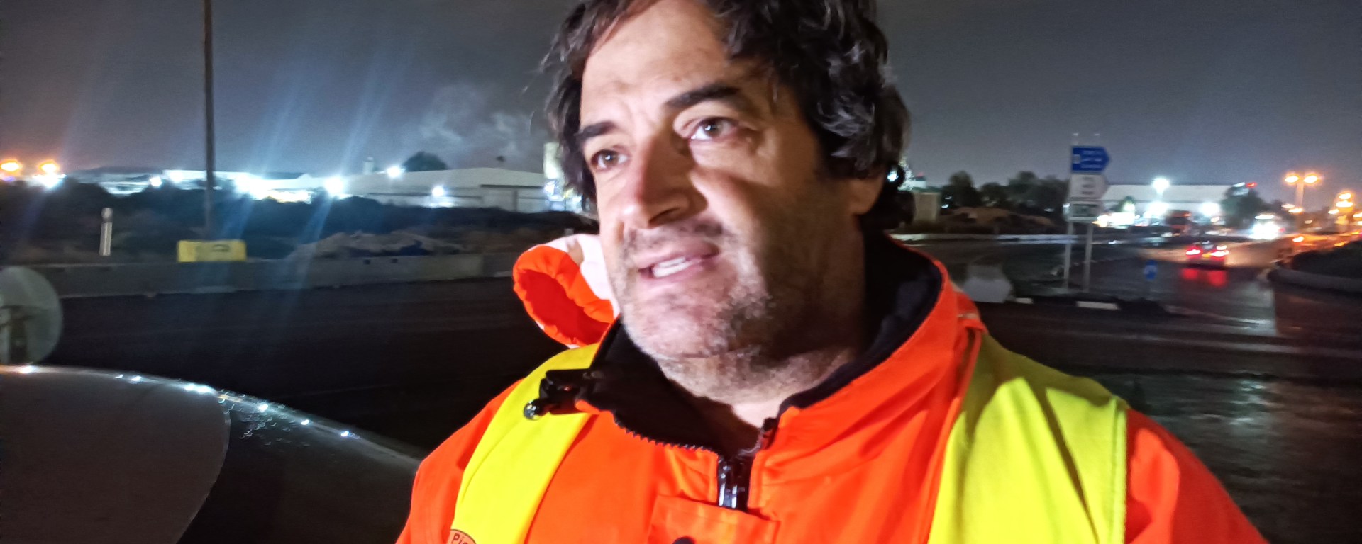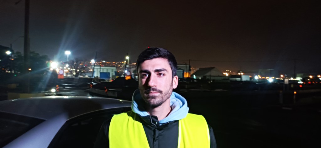 Face à l’entrée d’un des ports, Yonatane brave la pluie, le vent et le froid pour rejoindre Yaron Lapidot, co-fondateur avec Yael Gabbay de l’association IALS. Depuis 2014 l’IALS a fait des demandes répétées pour pénétrer dans l’enceinte du port afin d’assister aux débarquements des navires. Elle n’a toujours pas reçu les autorisations. Yaron est garé sur un rond-point. La nuit est noire malgré la pleine lune. La sortie du port mal éclairée, ce qui ne facilite pas les prises de vue. Yaron est bien équipé. Une caméra dans une main, un appareil photo dans l’autre. Lui et Yonatane vont passer la nuit entière à contrôler le débarquement depuis ce poste de fortune. Yaron connait les parcours des chauffeurs, leurs noms et le numéro de leur véhicule, qu’il reconnait à 20 mètres. Il est capable de définir si un chauffeur fait un excès de vitesse en se basant sur l’heure de retour des centres de quarantaine, ou encore la somme de déjections durant le voyage, en fonction du nombre d’animaux transportés : « la pollution se chiffre entre 12 tonnes et 280 tonnes par jour. Cela créé des déséquilibres, amènent des bactéries dans la mer, contribuant à l’acidification de l’eau, surtout dans la Méditerranée qui tourne en circuit fermé. 90 ans sont nécessaires pour qu’un litre d’eau se renouvelle. »