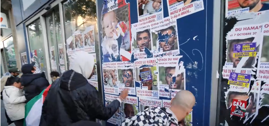 Ce visuel, sombre et percutant, montre un soldat brandissant un drapeau israélien face à la mer. Son graphisme ne doit rien au hasard : il s’inspire directement des scènes d’arrachage d’affiches qui ont marqué l’opinion publique en France ces derniers mois. Ces affiches, collées par des citoyens pour rappeler le sort des otages israéliens, avaient été vandalisées dans la rue avec une violence symbolique glaçante. Il s’agissait d’une campagne de collage citoyenne menée en France dans le cadre de l’initiative mondiale #BringThemHomeNow. On pouvait lire sur ces affiches : « Inutile de déchirer, il a déjà été arraché… »